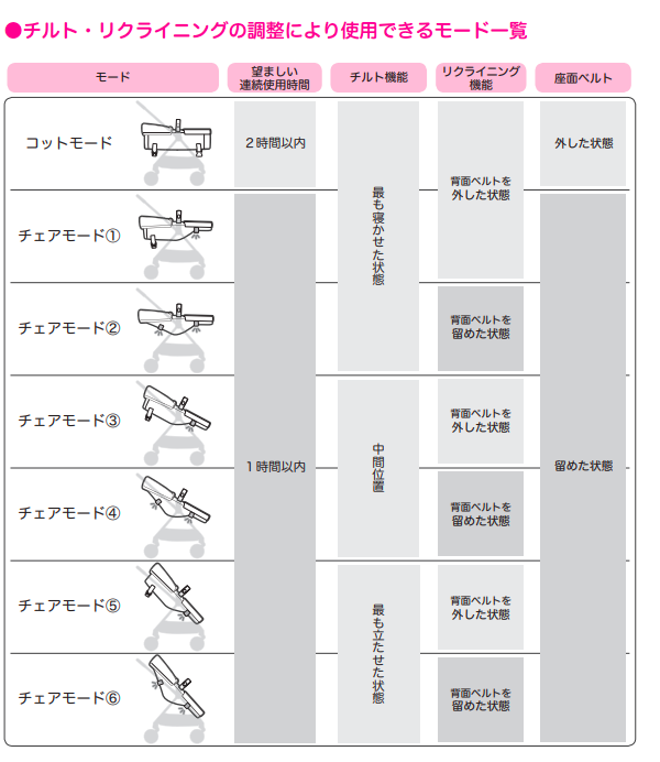 | 対象年齢 | ベッド状態:生後0ヶ月〜12ヶ月ごろ いす状態:生後4ヶ月ごろ(首すわり)〜36カ月ごろまで |