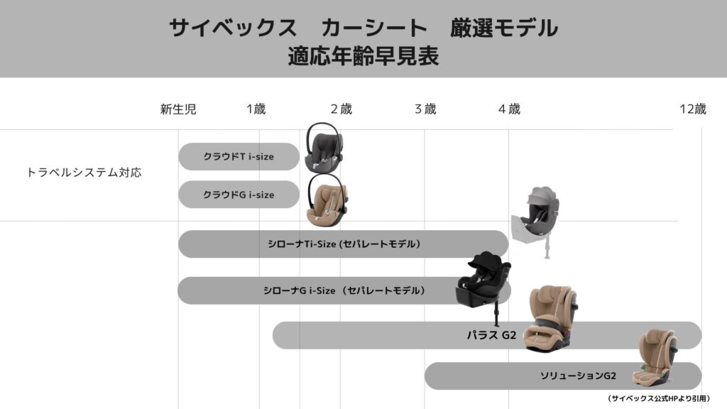 サイベックスのチャイルドシートをいくつかピックアップして早見表を作りました。