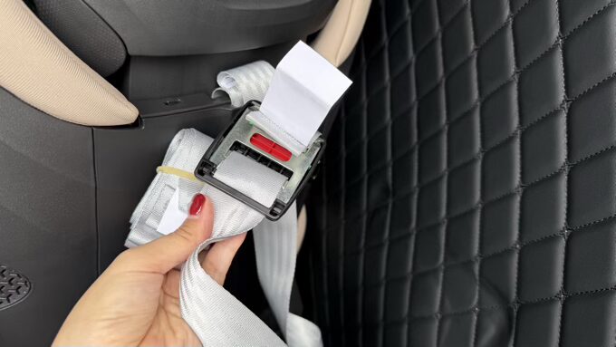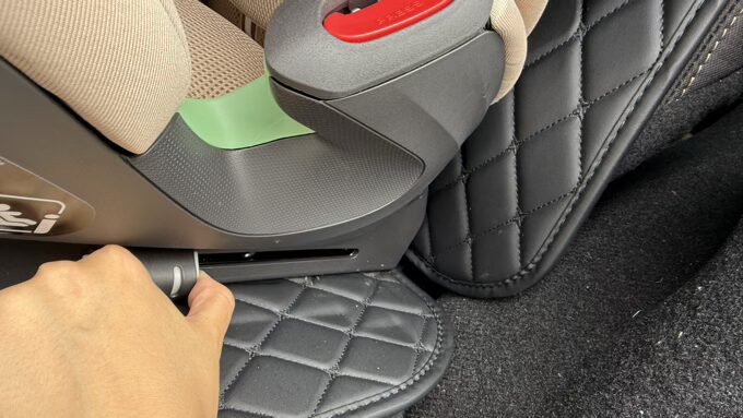 ISOFIXの調整をします。左右にレバーがついていたので、グレーのつまみを抑えながら奥へ差し込んでいきます。