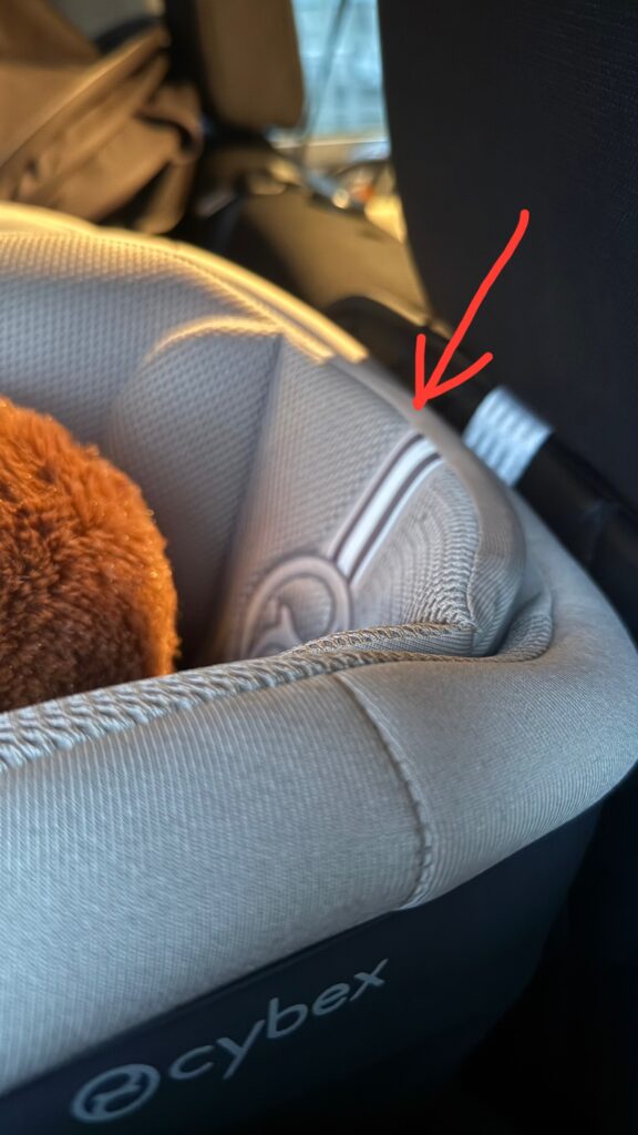 次に背中側にトップテザーベルトと呼ばれるベルトがあります。シートが前に行くのを防止するベルトです。